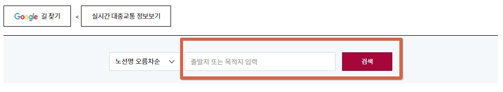 자신의 목적지를 아래 그림의 빨간색으로 표시된 검색창에 입력한 후 검색을 누릅니다.