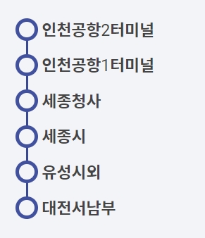 대전서남부 - 유성시외 - 세종시 - 세종청사 - 인천공항 1 터미널 - 인천공항 2 터미널