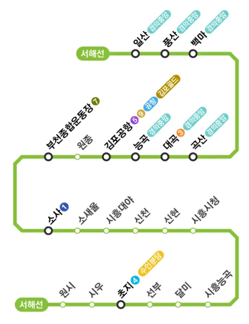 원시 - 시우- 초지 - 선부 - 달미 - 시흥능곡 - 시흥시청 - 신현 - 신천 - 시흥대야 -소새울 -소사 - 부천종합운동장 - 원종 - 김포공항 - 능곡 - 대곡 - 곡산 - 백마 - 풍산 - 일산