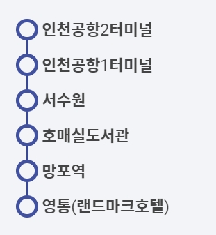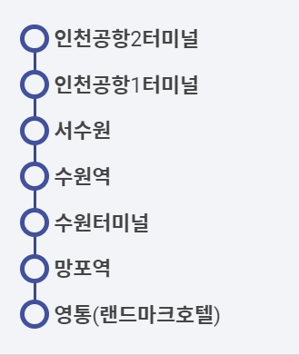 ✅영통(랜드마크호텔) (04293)- ✅망포역 (04082)- ✅수원터미널 (02936)- ✅수원역 (03190)- ✅서수원 (02899)- 인천공항 1 터미널 - 인천공항 2 터미널