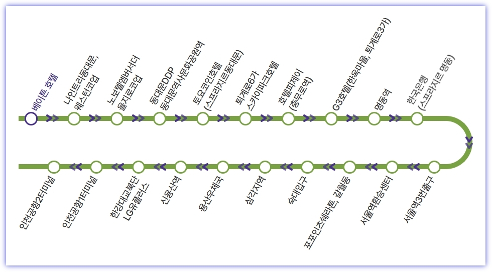 ✅베이튼호텔 (02712) -아카시아호텔.웨스턴코업레지던스 (02686) -을지로코업레지던스 (02687) -동대문역사문화공원 (02709) -토요코인호텔.이비스버젯호텔 (02688) -퇴계로6가 (02206) -충무로역.호텔피제이 (02679) -퇴계로3가.한옥마을.한국의집 (02151) -명동역.세종호텔 (02669) - 남대문시장 (02605) -서울역 (02665) -서울역버스환승센터 (02003) -갈월동 (03012) -숙대입구역 (03010) -삼각지역 (03008) -용산우체국 (03006) -신용산역 (03004) -한강대교북단.LG유플러스 (03002) - 인천공항 T1- 인천공항 T2