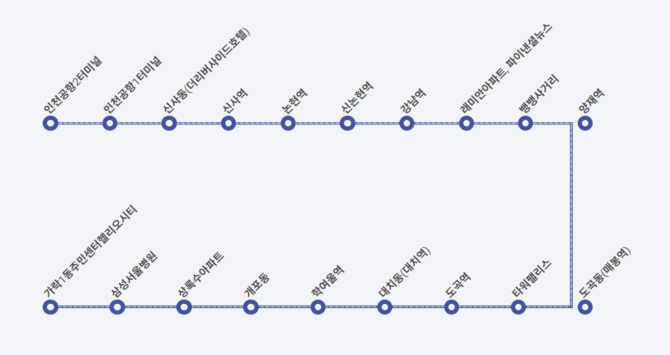 가락1동 주민센터 (24390) - 삼성서울병원정문건너편 (23382) - 푸른마을아파트앞 (23382) -일원초등학교 (23362) - 학여울역 (23838) - 대치동 (23839) - 도곡역2번출구.동부센트레빌 (23219) - 타워펠리스 (23840) - 매봉삼성아파트 sk 리더스뷰 (23316) -양재역 (23841) - 뱅뱅사거리 (22006) - 래미안아파트 (22008) - 신분당선강남역 (22010) - 2호선강남역 (22012) - 논현역 (22014) -신사역 (22016) -신사동 (23842) - 인천공항T1-3층 - 인천공항T2-3층