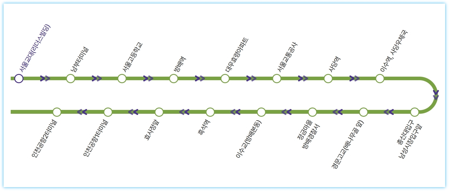 서울교육대앞 (22813) - 남부터미널 (22816) - 서울고교 (22810) -방배역 (22808) -대우효령아파트 (22802)- 서울교통공사 (22765) -사당역 (22763) -이수역 (22027) -총신대입구역. 남성사계시장입구 앞 (22029) -경문고등학교 (22031) -정금마을 (22033) -이수교 (22762) -흑석동 (22782) -효사정 앞 (20660) - 인천공항 T1-3층 - 인천공항 T2-3층