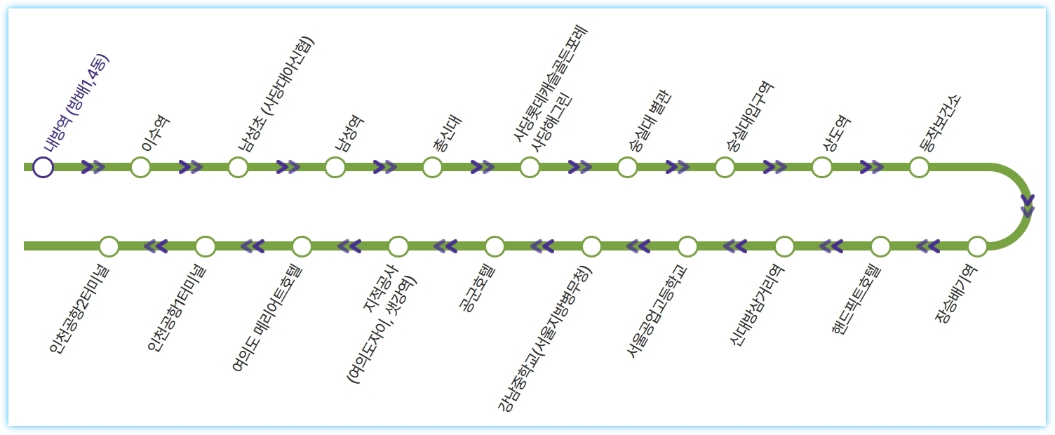 방배동 내방역에서 출발하여 총신대, 숭실대, 장승배기역, 신대방삼거리역, 여의도를 정차한 후, 인천공항으로 직행하는 노선입니다.