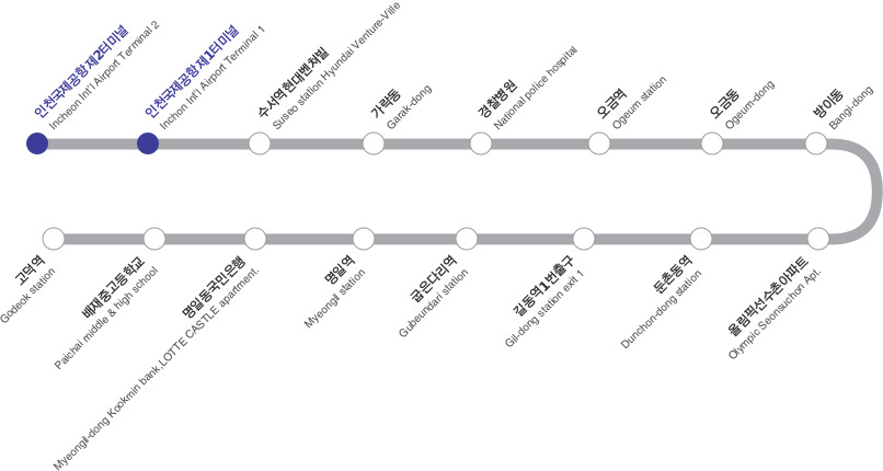 고덕역에서 출발하여 명일역, 방이동, 가락동, 수서역등을 정차한 후, 인천공항으로 직행하는 노선으로 강동지역에서 인천공항 갈 때 많은 분들이 이용하는 공항 리무진 버스입니다.